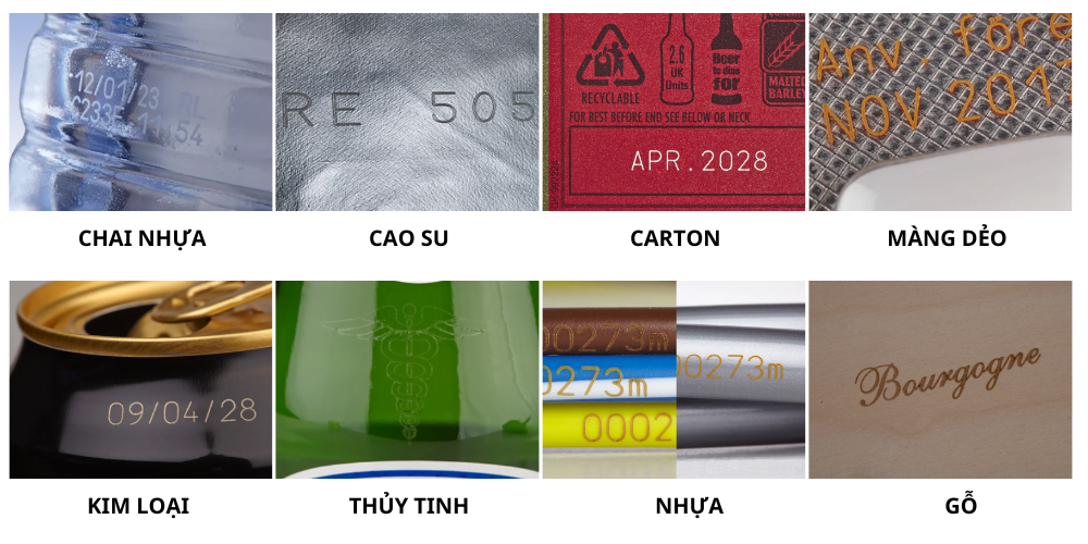 - Máy in laser có thể in trên các loại nhựa như PE, PET, PVC, HDPE, LDPE, cùng với màng dẻo và bìa cứng, đáp ứng tốt nhu cầu của nhiều ngành công nghiệp.