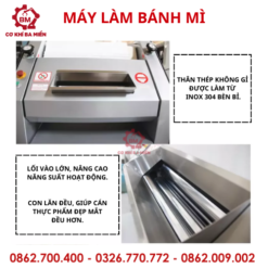 Máy làm bánh mì phù hợp với mọi loại bánh mì, đủ kích cỡ từ ngắn đến dài, tuỳ thuộc theo nhu cầu của người dùng. Máy có con lăn bằng inox không gỉ, nên khi cán bột và cho ra thành phẩm rất đẹp mắt, đều bánh, không bị loan lổ. Phù hợp cho các doanh nghiệp sản xuất bánh mì, kết hợp tối ưu với dây chuyền sản xuất, tạo ra nhiều giá trị cho doanh nghiệp.