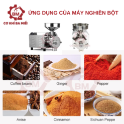 - Gia đình: Máy được sử dụng để nghiền các loại gia vị, thực phẩm tạo ra các sản phẩm như bột ớt, bột ngũ vị hương, bột tỏi, bột gừng… để sử dụng trong chế biến món ăn gia đình.