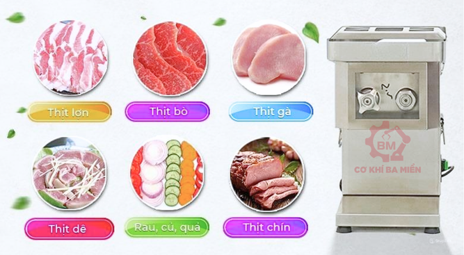 - Máy cũng có thể thái thịt thành nhiều hình dạng như lát mỏng, sợi, hay hạt lựu.